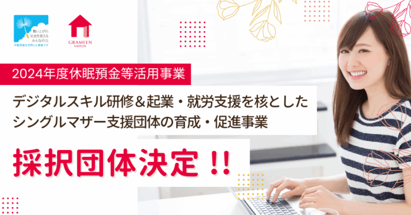 一般財団法人グラミン日本(本社:東京都中央区、理事長:百野公裕、以下「グラミン日本」)は、一般財団法人日本民間公益活動連携機構(JANPIA)(所在地:東京都千代田区、理事長:二宮雅也、英文名:Japan Network for Public Interest Activities、略称:JANPIA)の2024年度通常枠公募の休眠預金等活用法*に基づく資金分配団体として、デジタルスキル研修&起業・就労支援を核としたシングルマザー支援団体の育成・促進事業の実行団体を公募いたしました。
