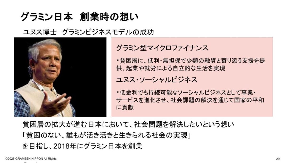 ムハマド・ユヌス博士により、バングラデシュに設立されたマイクロファイナンス機関「グラミン銀行」の日本版として2018年に設立。グラミン銀行は、生活困窮層の自立を支援した功績により2006年にノーベル平和賞を受賞しました。「誰もが活き活きと社会で活躍する持続可能な社会」の実現をビジョンに掲げ、主に生活困窮の状態にある女性に対して、生活資金ではなく「起業や就労の準備資金」を融資するマイクロファイナンスと、多様なパートナーとの共創によって生まれる「一歩を踏み出す機会」を提供することをミッションとしています。私達は、チャンスを願い、一歩を踏み出そうと想う人々の伴走者として、共に歩み続けます。